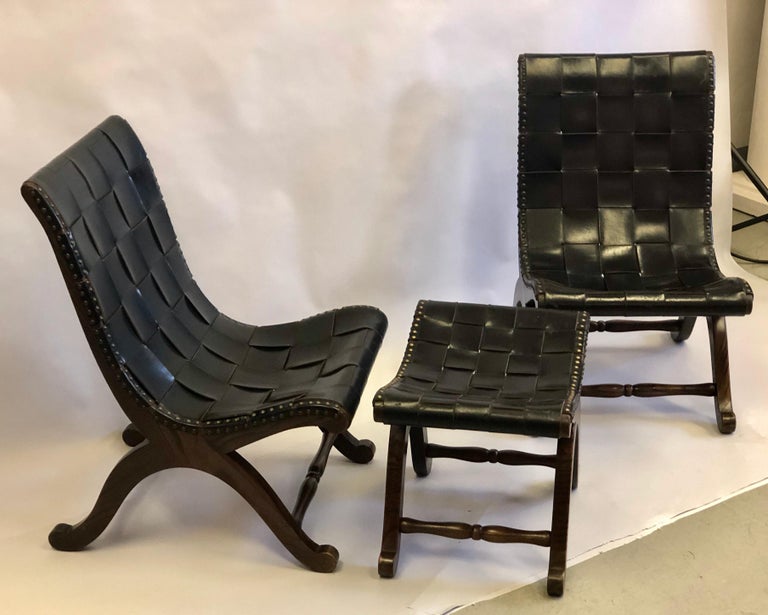 Pair Of Modern Neoclassical Black Leather Strap Chairs Attributed Pierre Lottier